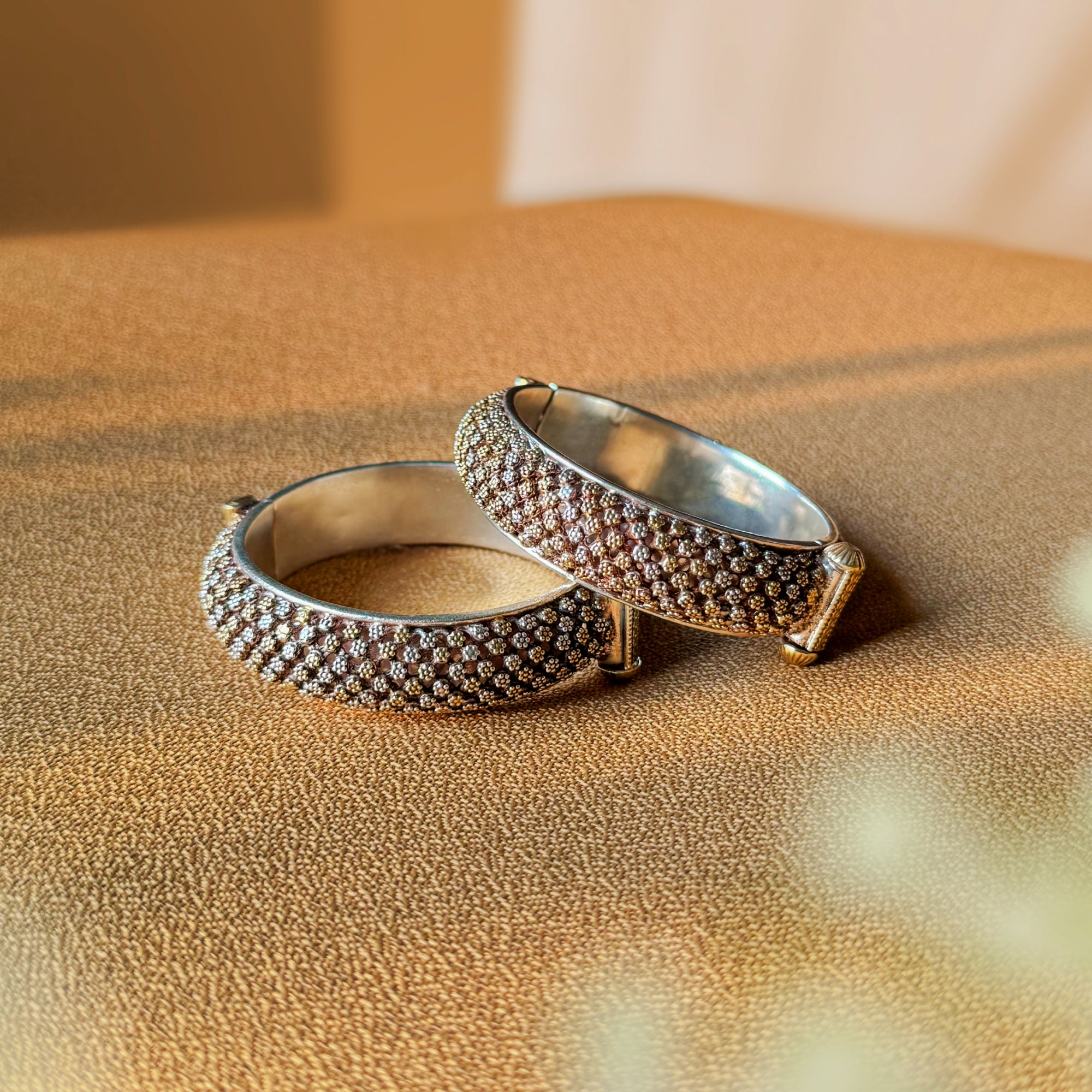 A bold and intricate silver kada, reminiscent of traditional craftsmanship with a contemporary twist.