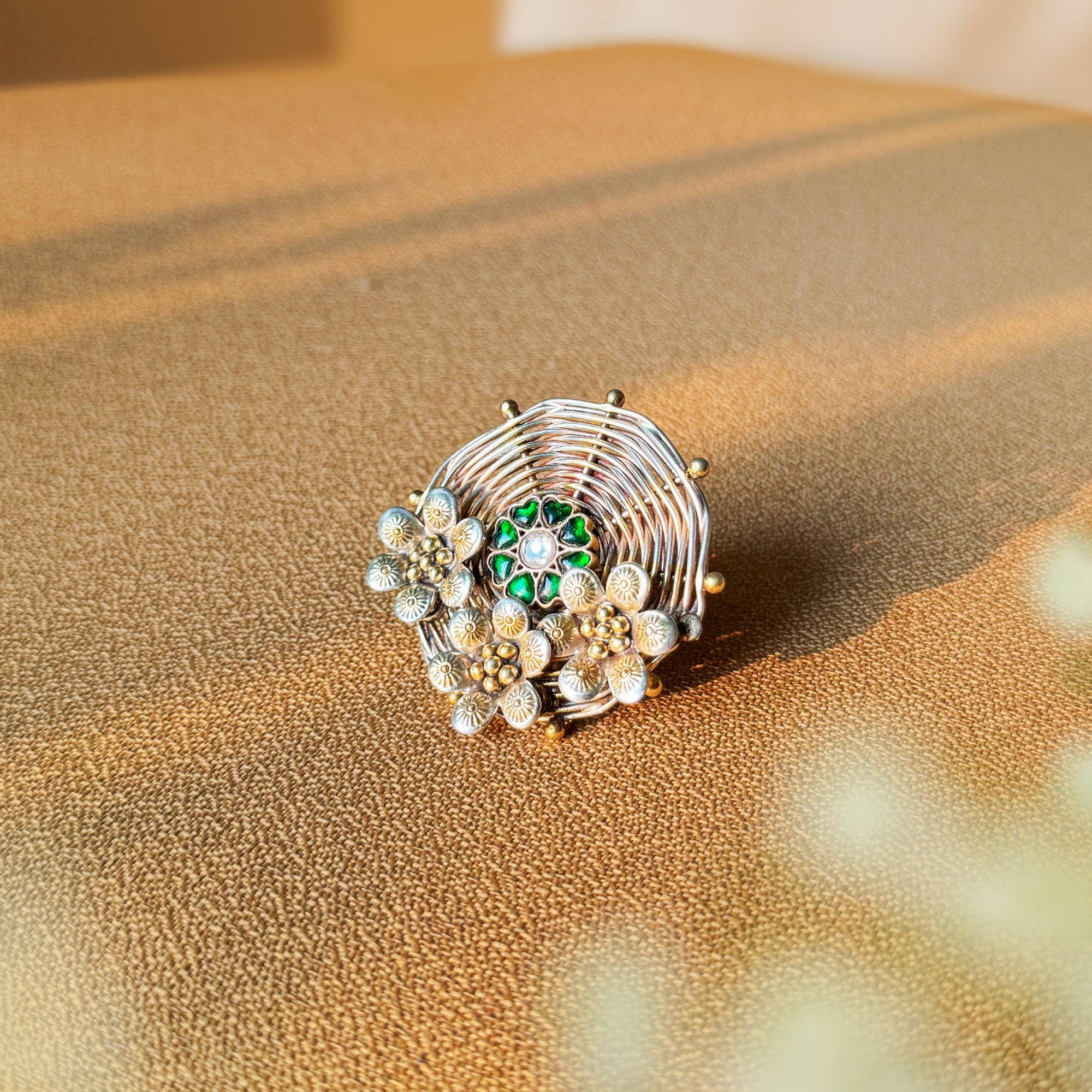 Delicately crafted ring featuring intricate floral patterns inspired by nature's beauty.