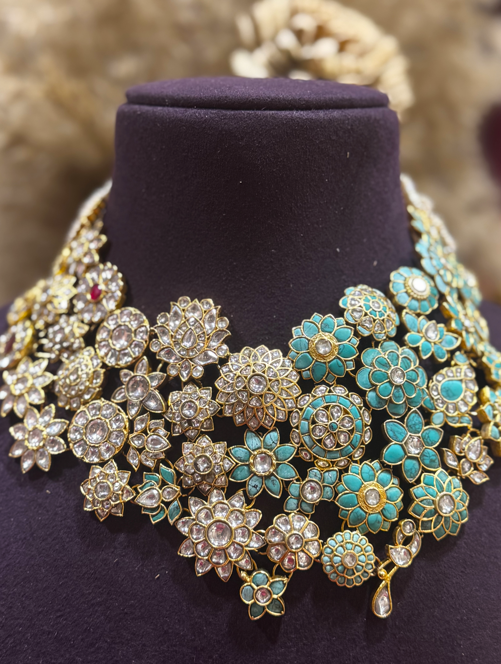 Echoing the carefree spirit of wildflowers in motion, this 925 silver necklace features organic floral forms enhanced with detailed tarkashi craftsmanship. The design feels light and expressive, celebrating natural freedom.