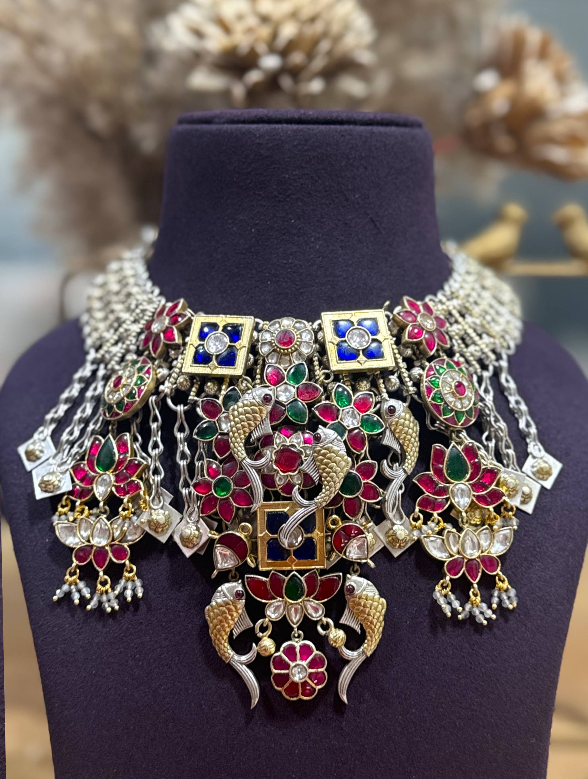 Inspired by flowers preserved in memory, this 925 silver necklace combines sculpted blossoms with fine tarkashi accents. Each element tells a quiet story of elegance, artistry, and enduring grace.