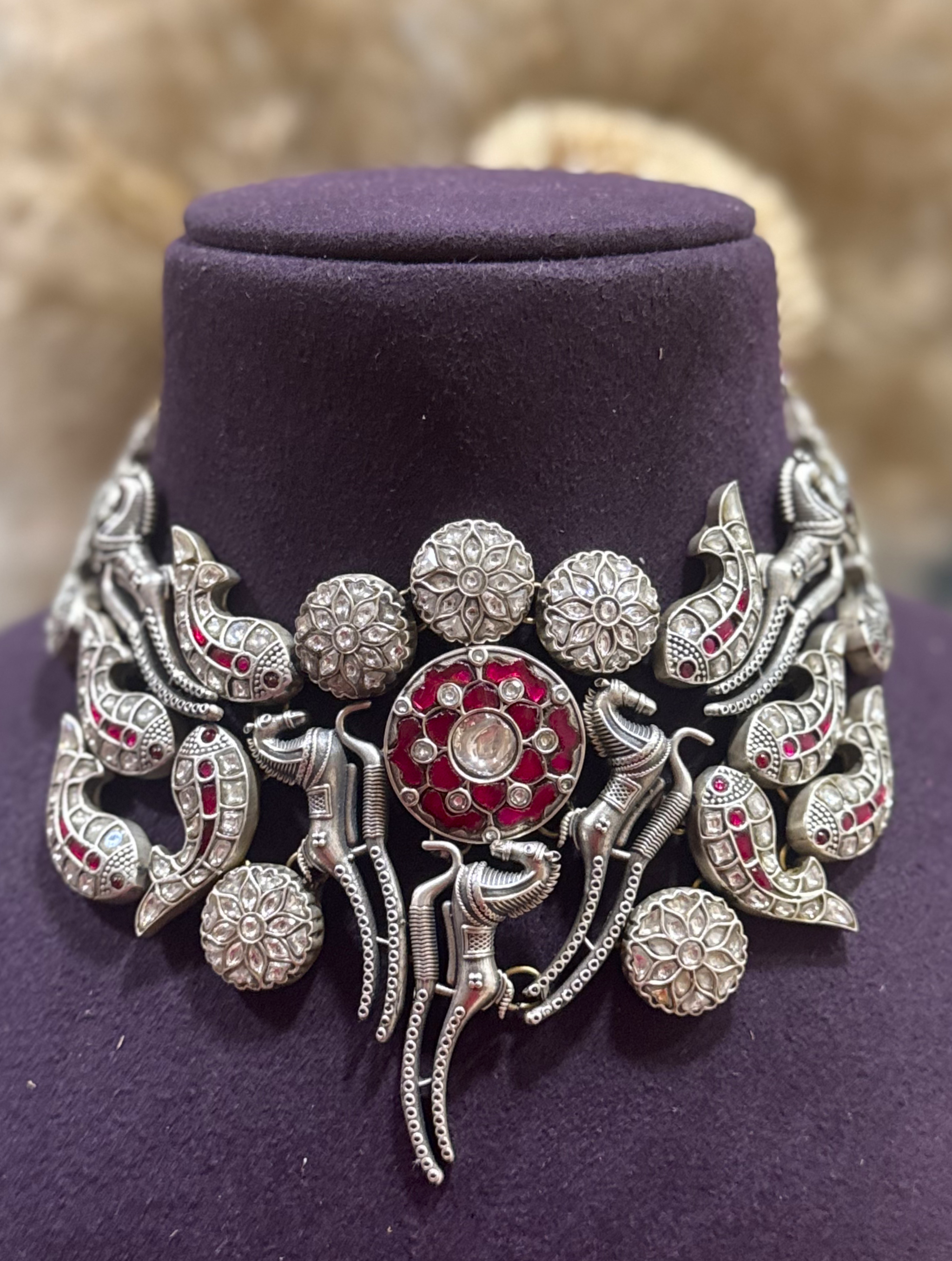 Reminiscent of a tranquil garden in bloom, this 925 silver necklace is adorned with meticulously carved floral motifs highlighted by intricate tarkashi patterns. The balanced composition exudes calm, poise, and refined charm.