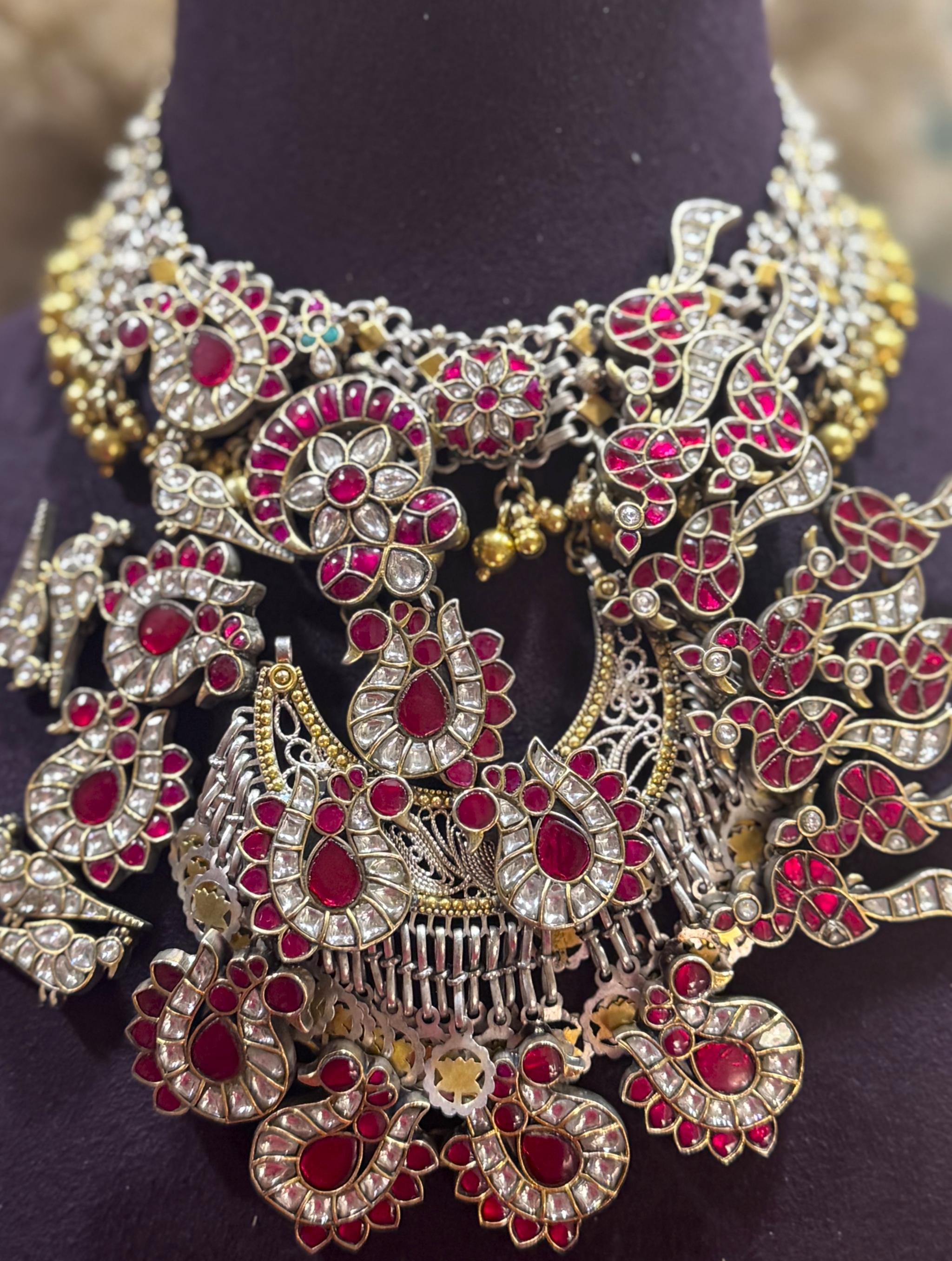 Inspired by Swansat dawn, this 925 silver necklace features delicately entwined tendrils brought to life with fine tarkashi detailing. The flowing forms create a graceful rhythm, echoing nature’s quiet elegance.
